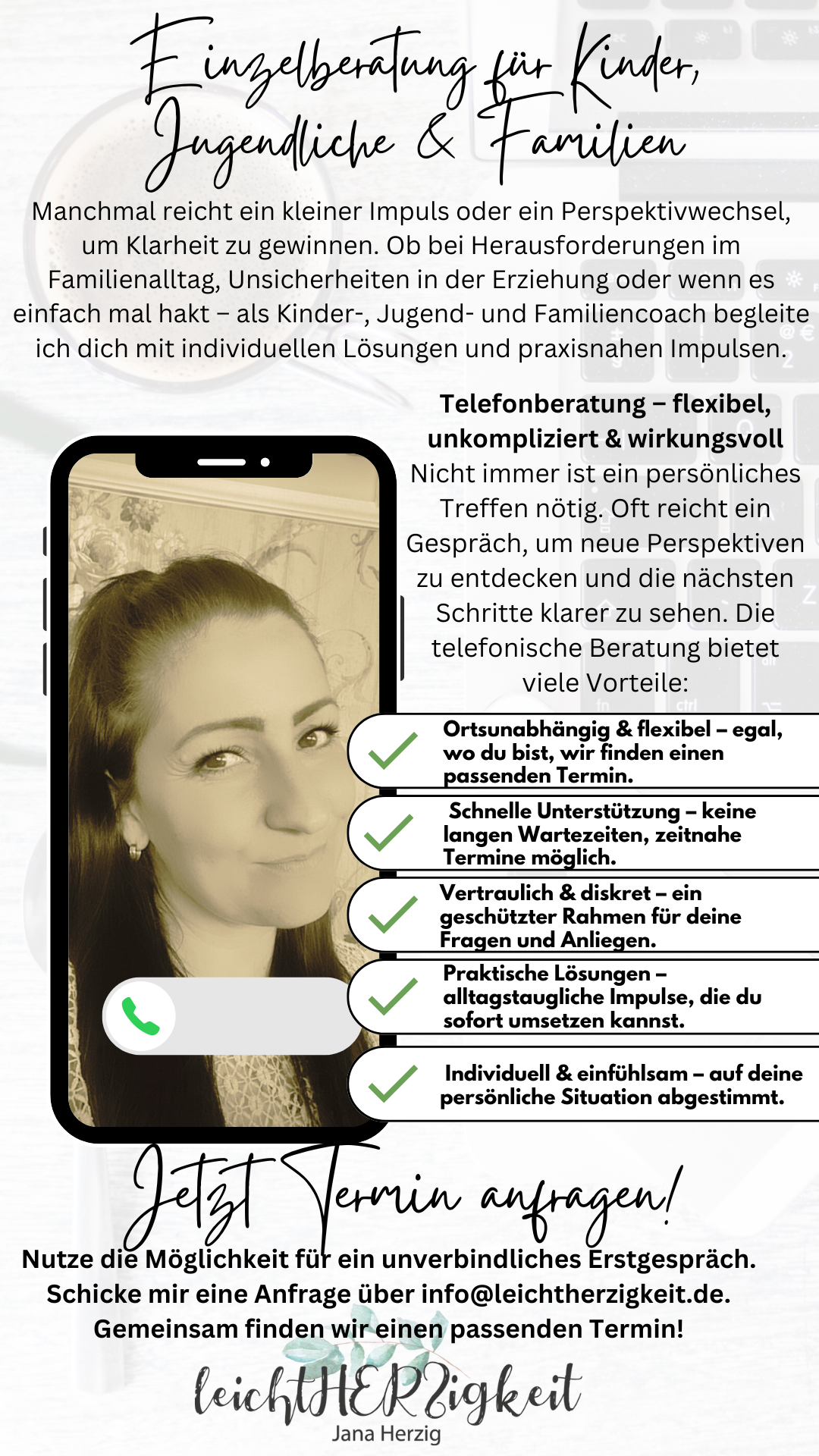 „Der Name sagt wirklich alles. So einfühlsam und ganz bei sich und unserem Thema,habe ich Menschen selten erlebt. Jana nimmt sich Zeit und geht auf alle Probleme und Bedürfnisse ein. Das Coaching hat mir und meinem Sohn so unendlich gut getan und aufgezeigt, wie besonders unsere Bindung ist. Ich war überwältigt, wie Jana sagte: "Ja, es darf fließen, es darf gehen, was an der Zeit ist". Danke dir meine Liebe, für das Augen öffnen und ganz bei mir sein.“